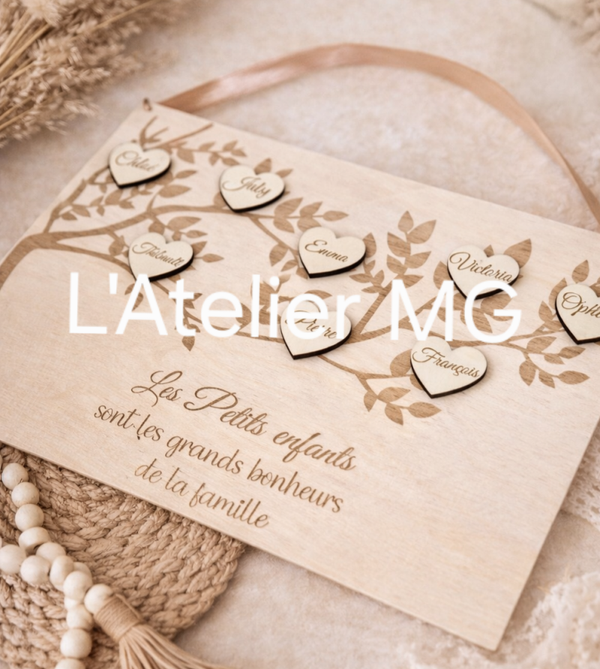 Chaque pancarte est réalisée avec soin, en bois naturel, et personnalisée avec les prénoms des petits-enfants gravés sur de jolis cœurs. Son design bohème et chaleureux en fait une décoration idéale à suspendre dans un salon, une entrée ou une chambre.