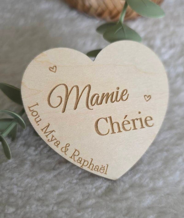Magnet cœur en bois gravé personnalisé, idéal comme cadeau mamie personnalisé. Ce magnet décoratif pour grand-mère, personnalisé avec les prénoms des petits-enfants, est un cadeau tendre et original pour la fête des grands-mères, un anniversaire ou Noël.